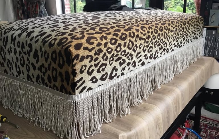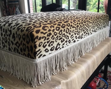 Rien ne se perd... Ce sommier a été converti en banquette douillette avec un velours sauvage imprimé panthère de chez Romo