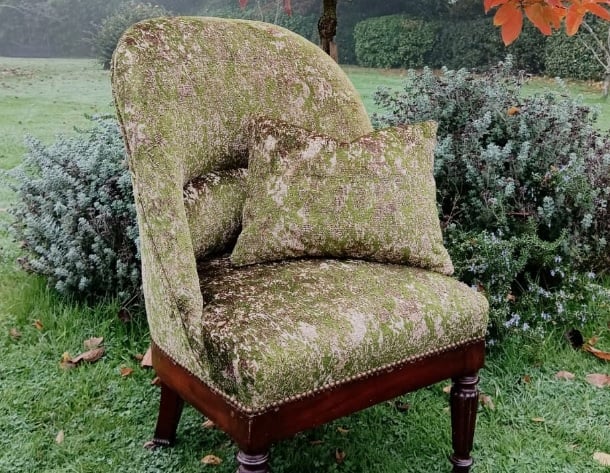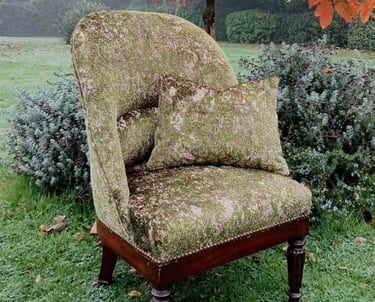 Restauration de ce fauteuil Napoléon III à l'armature en fer avec une couverture du dossier réalisée à la main dans un magnifique velours de la maison italienne Ardecora