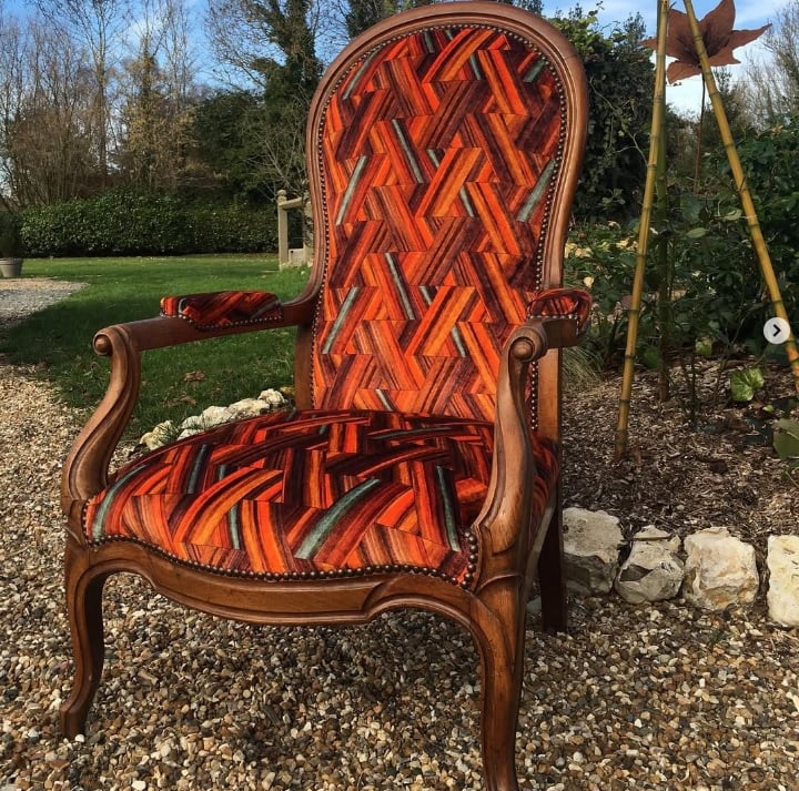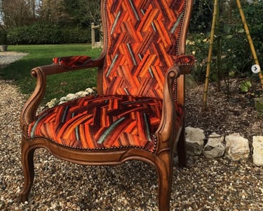 Réfection d'un fauteuil Voltaire avec un habillage en velours coloré (Casal)