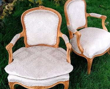 Couverture et aérogommage de cette paire de fauteuils Cabriolet avec un tissu en relief (Nobilis)